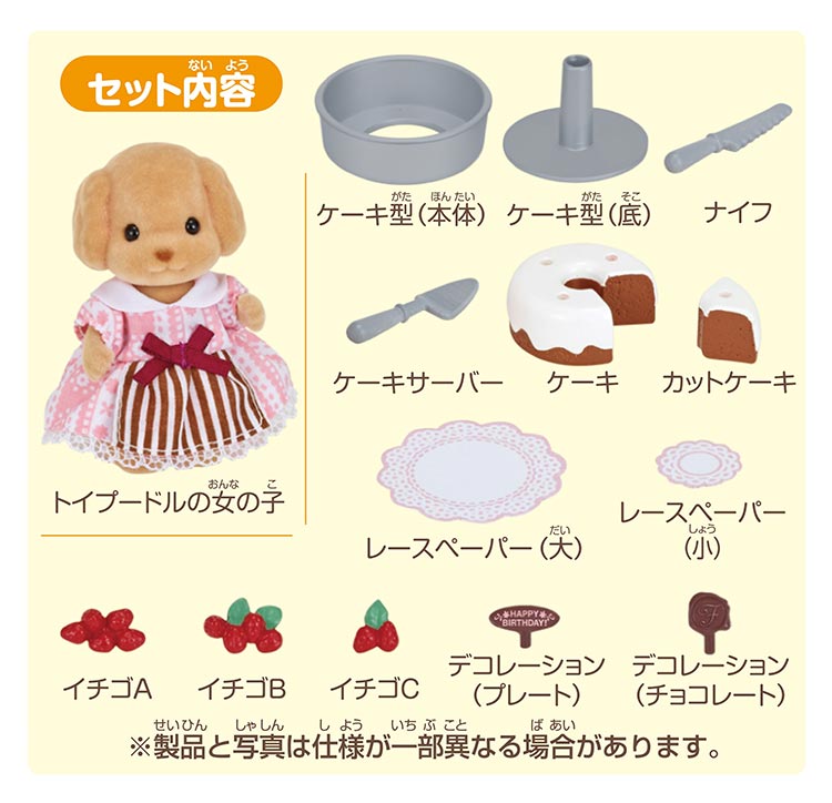 商品名VS-05 シルバニアファミリー かわいいパティシエセット サイズ125×130×50mm 品番VS-05 メーカーエポック社 補足【おもちゃ】【シルバニアファミリー】【トイプードル】【1604】 商品説明パティシエ風のお洋服を着たトイプードルの女の子と、かわいいケーキ、ケーキ作りの小物セットです。